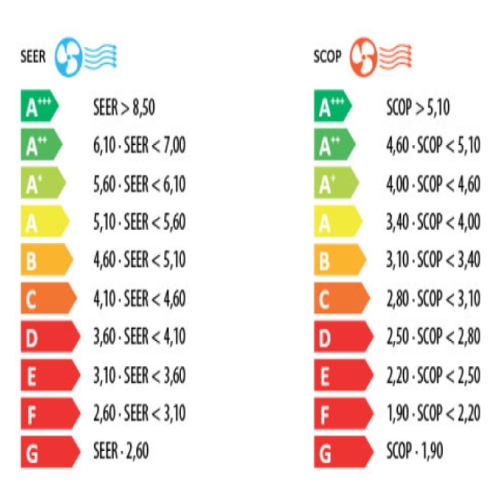 SCOP: fűtési jósági fok (Coefficient of Performance), klímaberendezések esetében azt jelenti, hogy fűtési üzemben 1 kW elektromos áram felhasználásával mekkora fűtőteljesítmény leadására képes a készülék. (minél nagyobb, annál takarékosabb) Hősugárzónál, olajradiátornál 1 az értéke :(